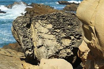 Although various definitions can be found in the scientific literature, tafoni (singular: tafone) are commonly defined as small (less than 1 cm (0.39 in)) to large (greater than 1 meter (3.3 ft)) cavity features that develop in either natural or manmade, vertical to steeply sloping, exposures of granular rock (i.e., granite, sandstone) with smooth concave walls, and often round rims and openings. Recognized subcategories of tafoni include honeycomb, stonelace, alveolar (less than 2 cm (0.79 in)), sidewall, basal, nested, and relic tafoni. It is also commonly synonymous with nido d’ape roccioso in Italian.[1]