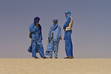 The tagelmust covers the head. It prevents the inhalation of wind-borne sand by its wearers in the Sahara region.[1] The indigo is also believed by many of the wearers to be healthy and beautiful, with a buildup of indigo in the skin of the wearer being generally considered to protect the skin, and denote affluence.[2] Because of the scarcity of water, the tagelmust is often dyed by pounding in dried indigo instead of soaking it. The dye often permanently leaches into the skin of the wearer, and because of this, the Tuareg are often referred to as the "blue men of the desert".[3]