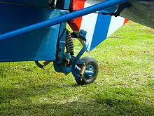 Conventional landing gear, or tailwheel-type landing gear, is an aircraft undercarriage consisting of two main wheels forward of the center of gravity and a small wheel or skid to support the tail.[1][2] The term taildragger is also used, although some claim it should apply only to those aircraft with a tailskid rather than a wheel.[2][3]