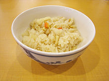 Takikomi gohan (炊き込みご飯, 炊き込み御飯) is a Japanese rice dish seasoned with dashi and soy sauce along with mushrooms, vegetables, meat, or fish. The ingredients of takikomi gohan are cooked with the rice; in a similar preparation, maze gohan (混ぜ御飯), flavorful ingredients are mixed into cooked rice.[1] In the Kansai region, takikomi gohan is called kayaku gohan, and in Okinawa, it is called Jucy.[2] This dish is consumed by people in Japan around the fall season since many root vegetables and mushrooms are harvested during this season in Japan.[3] Ingredients will vary based on the seasonal vegetables and fish. Since this dish contains nutritional value, and uses a small amount of rice with vegetables and proteins, some Japanese people eat it for dieting purposes.[4] One of the reasons why this dish is popular in Japan is because it is easy to make and does not require a lot of equipment to prepare.