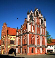 The Tangermünde Town Hall is a late medieval building constructed in the 1430s. In German, this building is referred to as Rathaus and serves as a civic meeting center. The building performs a secular purpose, as a town hall for the community, but its exterior is evocative of a mixture of Romanesque and Gothic features. This building contains gothic and Romanesque structural elements that appear on the exterior of the building (the interior of the building has not been widely photographed).