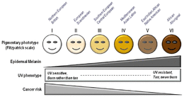 - ^ Lessin et al. (2012): "UVA is predominantly responsible for tanning of the skin and UVB is responsible for burning. Tanning is a human defense mechanism directed against DNA damage induced by UVR exposures. Melanin-containing melanocytes are closely associated with keratinocytes within the epidermis, and baseline pigmentation is tightly controlled by complex cellular and intercelluar pathways. Evolutionary and adaptive changes have created diversity of human pigmentation, skin types, and tanning capacities. Tanning results when UVR-induced melanogenesis increases pigment levels in the skin above baseline, and repeated exposures maintain these elevated levels. Tanning is a secondary response to UVR-induced DNA damage and molecularly linked to DNA repair pathways. Tanning beds produce UVR similar to the sun, and likewise cause DNA damage and contribute to the development of skin cancers among humans."[1]