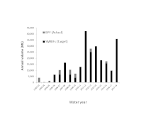 The SWIOID 2002 identifies a target of 27GL (i.e. 30% of the Mean Annual Natural Flow- MANF) in a full allocation scenario. Since 2005-06, environmental water has been released to the Upper Murrumbidgee River to repair the condition of the river. Over the period 2005 to 2018, an average of 17.7GL/year of environmental water has been released to the upper Murrumbidgee River. The annual allocation varied between 4 GL/ year during the drought and 42.3 GL /year once sufficient water had been recovered.[5]