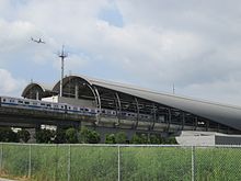 The Taoyuan Airport MRT route starts from Taipei Main Station and heads west, passing through Sanchong, Taishan, Xinzhuang, Guishan, Linkou, and Luzhu before reaching Taoyuan International Airport, after which the route turns south to THSR Taoyuan Station before terminating at Huanbei in Zhongli.[7] The route is currently 53.07 km (32.98 mi) long[8] with 21 total stations,[4] of which 6 are underground and 15 are elevated;[9][note 1] approximately 12.96 km (8.05 mi) of the line is underground while the remaining 40.11 km (24.92 mi) is elevated.[8] There are two maintenance depots along the line; Qingpu Depot (near Linghang) and Luzhu Depot.[8]