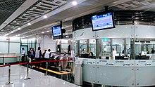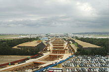 The airport section consists of four underground stations (Airport Terminal 1, Airport Terminal 2, Airport Hotel, and the future Airport Terminal 3 station) and is 6.85 km (4.26 mi) long.[16] Both cut-and-cover and shield tunneling were used for tunnel construction.[7] Since shield tunnels were constructed underneath existing taxiways and the control tower area, an automatic system was integrated to monitor any soil and structure impact in real-time so that immediate response could be taken to any disruption. In the same section, secondary grouting and a micro-pile cut-off wall was used to reinforce the tunnels. In addition, a floating track bed was used for the tracks crossing these areas to reduce vibrations.[7] Continental Engineering Corporation constructed the underground stations and the tunnels in this section.[53]