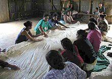 "A circular cut is made with a shell in the bark above the root of the tree; the tree is broken off, and in a few days, when the stem is half-dry, the bark and bast are separated from it. The bast is then cleaned and macerated in water, after which it is beaten with the ribbed club on a wooden block. This beating enlivens a village in Tonga as threshing does in Europe. In half an hour the piece will have changed in shape from a strip almost to a square. The edges are snipped with shells, and a large number of the pieces are drawn separately over a semi-cylindrical wooden stamp, on which the pattern, worked in coco-fibre, is stretched and smeared with a fluid at once adhesive and colouring. On each a second and third layer is placed; and the piece, three layers thick, is coloured more strongly in the parts which are thrown into relief by the inequalities of the bed. Others are annexed to it both at the side and the end, until pieces a yard wide, and 20 to 25 yards long, are produced. — Friedrich Ratzel, (1896)[7]