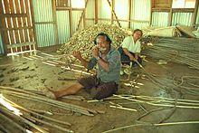 In Tonga hiapo is the name given to the paper mulberry tree. It is not usually grown in whole plantations, but portions of a yam or other vegetable garden are often set aside for it.[6] They are cut and brought home where the first task is to strip the bark from the trees. The strips are about hand wide and person long. The wood left-over is named mokofute. The bark consists of two layers; the outer bark is scraped or split off from the inner bark. This work is called haʻalo. The outer bark is discarded; the inner bark, named tutu or loututu, is left-over. It is dried in the sun before being soaked.