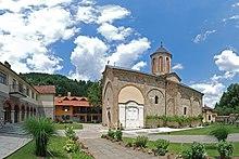 The Rača monastery is a Serbian Orthodox monastery built by king Stefan Dragutin (1276-1282) on the right bank of the Rača river. Three centuries later, a famous scriptorium, known as the School of Rača (Serbian: Рачанска школа, romanized: Račanska škola) developed and flourished in the 16th and 17th century. The monks translated texts from Ancient Greek, wrote histories, and copied manuscripts. They translated and copied not only liturgical but scientific and literary works of the period so the history of Serbian literature is owing a lot to it. Turkish travel writer, Evliya Çelebi noted in his travelogue of 1630 that in Rača Monastery there were 300 monk scribes, who were served by 400 shepherds, blacksmiths, and other staff. The security guard included 200 armed men. It was damaged several times during the Ottoman period. During the Great Turkish War the monastery was partially destroyed by the invading Turks in 1689. In 1826 it was reconstructed due to being burned down several times. Gendarmerie lieutenant colonel Jaraković handed over the Miroslav Gospel to hegumen Platon Milojević in 1941, who kept it during the war. The Rača monastery is declared a cultural monument.[9] Next to the monastery's glebe is the horse ranch and training yard "Dora", opened in 2007.[18]