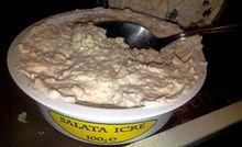 A dip, fasole bătută or fasole făcăluită (mashed beans), prepared with mashed beans, sunflower oil, garlic and chopped onions, is sometimes called icre de fasole (beans roe).[8]
