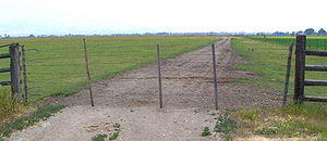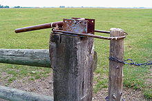 This type of gate has many different local names throughout the world, sometimes hinting at its rough-and-ready nature and cheap construction. The term "Hampshire gate" is widely used in Britain (including Hampshire) – the names of other counties are occasionally substituted, or more often that of New Zealand. In New Zealand itself it is called a Taranaki gate,[1] while in Ireland it is known as a slap, and in Australia as a cocky's gate ("cocky" is vernacular for "farmer"), bogan gate, running gate, machinery gate or Queensland gate. In the United States it is simply called a wire gate. Though the origins of the gate are obscure, the name Taranaki Gate is believed to reflect the location of its first widespread use;[2] it may well have been invented independently in several places.