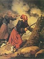 A version of the fez was used as an arming cap for the 1400–1700s version of the mail armour head protector (a round metal plate or skull-cap, around which hung a curtain of mail to protect the neck and upper shoulder). The red fez with blue tassel was the standard headdress of the Turkish Army from the 1840s until the introduction of a khaki service dress and peakless sun helmet in 1910. The only significant exceptions were cavalry and some artillery units who wore a lambskin hat with coloured cloth tops.[17] Albanian levies wore a white version of the fez, resembling their traditional qeleshe. During World War I the fez was still worn by some naval reserve units and occasionally by soldiers when off duty.[18] The Evzones (light infantry) regiments of the Greek Army wore their own distinctive version of the fez from 1837 until World War II. It now survives in the parade uniform of the Presidential Guard in Athens.