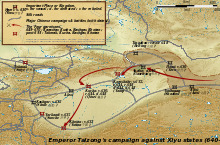 During the Tang Dynasty, a series of military expeditions were conducted against the oasis states of the Tarim Basin, then vassals of the Western Turkic Khaganate.[35] The campaigns against the oasis states began under Emperor Taizong with the annexation of Gaochang in 640.[36] The nearby kingdom of Karasahr was captured by the Tang in 644 and the kingdom of Kucha was conquered in 649.[37]