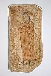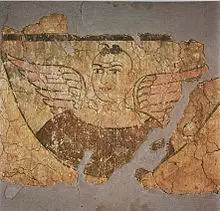 Additional excavations have unearthed tombs with mummies,[82] tools, ceramic works, painted pottery and other artistic artifacts. Such diversity was encouraged by the cultural contacts resulting from this area's position on the Silk Road.[83] Early Buddhist sculptures and murals excavated at Miran show artistic similarities to the traditions of Central Asia and North India[84] and stylistic aspects of paintings found there suggest that Miran had a direct connection with the West, specifically Rome and its provinces.[85]