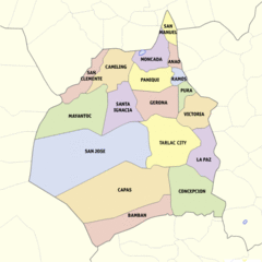 The 17 municipalities and 1 city of the province comprise a total of 511 barangays, with Cristo Rey in Capas as the most populous in 2010, and Malonzo in Bamban as the least. [7]