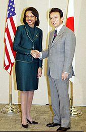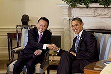 Prime Minister Asō flew to Washington to meet with United States President Barack Obama in February 2009. He was the first foreign leader to visit the Obama White House; however, reports suggested that the new administration was interested less in giving Asō a political boost than in sending a message that Japan continues to be an important ally and partner[25] – a low-risk, high-payoff gesture for both Asō and Obama.[26]