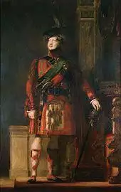 In the 1820s, as part of the Romantic revival, tartan and the kilt were adopted by members of the social elite, not just in Scotland, but across Europe.[4][5] The international craze for tartan, and for idealising a romanticised Highlands, was set off by the Ossian cycle published by Scottish poet James Macpherson's in 1761-2.[6][7] Sir Walter Scott's Waverley novels further helped popularise select aspects of Scottish life and history and he founded the Celtic Society of Edinburgh in 1820.[8] He staged the royal Visit of King George IV to Scotland in 1822 and the king's wearing of tartan. George IV was the first reigning monarch to visit Scotland in 171 years.[8] Scott and the Celtic Society urged Scots to attend festivities "all plaided and plumed in their tartan array".[9] One contemporary writer sarcastically described the pomp that surrounded the celebrations as "Sir Walter's Celtified Pageantry".[10][11] Nevertheless, the result was a massive upsurge in demand for kilts and tartans that could not be met by the Scottish linen industry.[12]