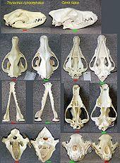 They are easy to tell from a true dog because of the stripes on the back but the skeleton is harder to distinguish. Zoology students at Oxford had to identify 100 zoological specimens as part of the final exam. Word soon got around that, if ever a 'dog' skull was given, it was safe to identify it as Thylacinus on the grounds that anything as obvious as a dog skull had to be a catch. Then one year the examiners, to their credit, double bluffed and put in a real dog skull. The easiest way to tell the difference is by the two prominent holes in the palate bone, which are characteristic of marsupials generally.