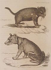 The first detailed scientific description was made by Tasmania's Deputy Surveyor-General, George Harris in 1808, five years after first settlement of the island.[19][20] Harris originally placed the thylacine in the genus Didelphis, which had been created by Linnaeus for the American opossums, describing it as Didelphis cynocephala, the "dog-headed opossum". Recognition that the Australian marsupials were fundamentally different from the known mammal genera led to the establishment of the modern classification scheme, and in 1796, Geoffroy Saint-Hilaire created the genus Dasyurus where he placed the thylacine in 1810. To resolve the mixture of Greek and Latin nomenclature, the species name was altered to cynocephalus. In 1824, it was separated out into its own genus, Thylacinus, by Temminck.[21] The common name derives directly from the genus name, originally from the Greek θύλακος (thýlakos), meaning "pouch" or "sack".[22][a]