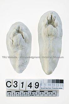More detail can been seen in a cast taken (below and to the left) from a freshly dead thylacine. The cast shows the plantar pad in more detail and shows that the plantar pad is tri-lobal in that it exhibits three distinctive lobes. It is a single plantar pad divided by three deep grooves. The distinctive plantar pad shape along with the asymmetrical nature of the foot makes it quite different from animals such as dogs or foxes. This cast dates back to the early 1930s and is part of the Museum of Victoria's thylacine collection.[34]