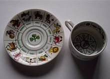 | Zodiac cups | These sets contain zodiacal and planetary symbols. Typically the interior of the cup contains the planetary symbols, while the saucer has the astrological sign symbols, but there are many variations and exceptions to this common pattern. The placement of these symbols allows the reader to combine astrology with tasseography. |