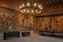 The second floor was the Audience Chamber, and only the finest of guests would have been admitted here. A brick vaulted corridor led to a small waiting room, before the great hall of the Audience Chamber, which today houses Flemish tapestries bought by Lord Curzon.[4]