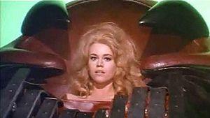 - Barbarella (1968), film written by Vittorio Bonicelli et al. and directed by Roger Vadim based on Jean-Claude Forest's French Barbarella comics. Barbarella is assigned by the President of Earth to retrieve Dr. Durand Durand—inventor of the Positronic Ray—from the planet Tau Ceti that he might use it to help save the Earth. The mission starts badly as she crashes on an icy plain of her destination world. After a lengthy and complicated sequence of concussions, captures, rescues, grateful copulations, wardrobe malfunctions, and repeated changes into ever scantier costumes, culminating in a confrontation with the Tyrant of the decadent city of Sogo,[note 4] Barbarella discovers Durand Durand—who has other ideas than returning to Earth with her, starting with the Excessive Machine (see graphic). The alien world of Tau Ceti is distinguished by a real, if intermittent sense of wonder created by the sheer otherworldliness of the production design and art direction.[23]