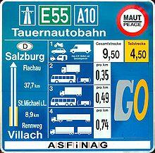 The section between the Flachau and Rennweg junctions, including the Tauern and Katschberg Tunnels, is a so-called special toll route. In this area instead of the general Austrian vignette requirement, extra tolls (a one–way Maut currently(2020) at €12.50) are paid in cash or by credit card at the toll plaza at Sankt Michael, or via a Videomaut prepaid system. For driving on all other sections of the A10 the standard vignette is required.