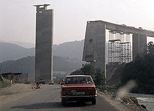 The difficult crossing of the Alpine divide started in 1971. On 16 May 1975, within the section between Gmünd and Spittal, the falsework of a newly built bridge collapsed and fell from a height of 50 m (160 ft), killing ten workers. The Spittal junction opened in 1980; the A10 down to Villach was completed in 1988. After eight people died in a 1999 fire in the Tauern Tunnel following a truck accident, the single-bore tunnels were expanded at a total cost of 324 million euros. Traffic congestion now occurs at the Karawanken Tunnel further to the south.