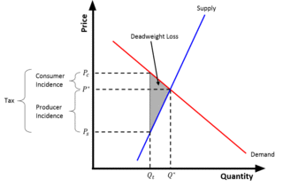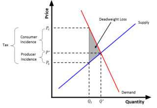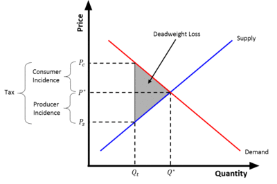 The filled-in "wedge" created by a tax actually represents the amount of deadweight loss created by the tax.[2] Deadweight loss is the reduction in social efficiency (producer and consumer surplus) from preventing trades for which benefits exceed costs.[2] Deadweight loss occurs with a tax because a higher price for consumers, and a lower price received by suppliers, reduces the quantity of the good sold.[2] Thus, the equilibrium quantity of a taxed good is lower than the equilibrium quantity when the same good is not taxed. The deadweight loss created by the tax is equal to ,[2] represented by the shaded triangle in the figure.