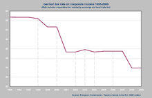 As of 1 January 2008, Germany's corporation tax rate is 15%. Counting both the solidarity surcharge (5.5% of corporation tax) and trade tax (averaging 14% as of 2008), tax on corporations in Germany is just below 30%.