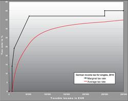 The rate of income tax in Germany ranges from 0% to 45%. The German income tax is a progressive tax, which means that the average tax rate (i.e., the ratio of tax and taxable income) increases monotonically with increasing taxable income. Moreover, the German taxation system warrants that an increase in taxable income never results in a decrease of the net income after taxation. The latter property is due to the fact that the marginal tax rate (i.e., the tax paid on one euro additional taxable income) is always below 100%. The marginal tax rates and the resulting average tax rate of the income tax are depicted in the graph to the right. The tax liability of married couples who file jointly is assessed on half their total income, and the result from applying the tax tariff is multiplied by two afterwards. Due to the progressive tax schedule, this always more favorable than taxing each spouse separately. This splitting advantage increases with the income difference between both spouses.