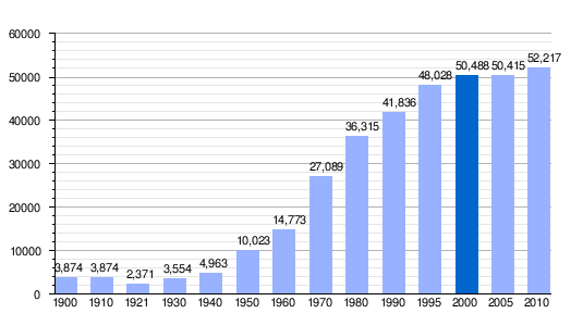 Taxco's population as of 2010 was 52,217 (in 13,933 households), of whom 48% were men and 52% were women.[9][10] Taxco's population grew rapidly from 1950 (10,023) to 2000 (50,488).[10]