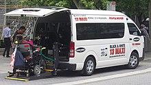 Wheelchair accessible maxicab, unloading a wheelchair-bound passenger in Australia