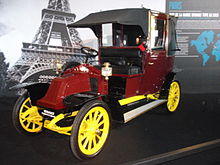 The modern taximeter was invented and perfected by a trio of German inventors; Wilhelm Friedrich Nedler, Ferdinand Dencker and Friedrich Wilhelm Gustav Bruhn.[19] The Daimler Victoria—the world's first gasoline-powered taximeter-cab—was built by Gottlieb Daimler in 1897 and began operating in Stuttgart in 1897.[20] Gasoline-powered taxicabs began operating in Paris in 1899, in London in 1903, and in New York in 1907. The New York taxicabs were initially imported from France by Harry N. Allen owner of the Allen-Kingston Motor Car Company.[21] Their manufacturing took place at Bristol Engineering in Bristol, Connecticut where the first domestically produced Taxicabs were built in 1908, designed by Fred E. Moskovics who had worked at Daimler in the late 1890s. Albert F. Rockwell was the owner of Bristol and his wife suggested he paint his taxicabs yellow to maximise his vehicles' visibility.[22] Moskovics was one of the organizers of the first Yellow Taxicab Company in New York.[23]
