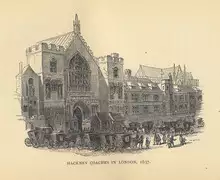 Horse-drawn for-hire hackney carriage services began operating in both Paris and London in the early 17th century. The first documented public hackney coach service for hire was in London in 1605.[10] In 1625 carriages were made available for hire from innkeepers in London and the first taxi rank appeared on the Strand outside the Maypole Inn in 1636.[11] In 1635 the Hackney Carriage Act was passed by Parliament to legalise horse-drawn carriages for hire. Coaches were hired out by innkeepers to merchants and visitors. A further "Ordinance for the Regulation of Hackney-Coachmen in London and the places adjacent" was approved by Parliament in 1654[12] and the first hackney-carriage licences were issued in 1662.