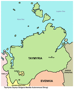 Taymyr Dolgano-Nenets Autonomous Okrug (Russian: Таймы́рский Долга́но-Не́нецкий автоно́мный о́круг, Taymyrsky Dolgano-Nenetsky avtonomny okrug), or Taymyria (Таймырия, Taymyriya), was a federal subject of Russia (an autonomous okrug of Krasnoyarsk Krai), the northernmost in Siberian Russia (and thus North Asia). It was named after the Taymyr Peninsula. It was also called Dolgan-Nenets Autonomous Okrug (Долгано-Ненецкий автономный округ), by the name of the indigenous people, Dolgans and Nenetses.