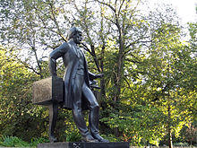 Tchaikovsky remained abroad for a year after the disintegration of his marriage. During this time, he completed Eugene Onegin, orchestrated his Fourth Symphony, and composed the Violin Concerto.[80] He returned briefly to the Moscow Conservatory in the autumn of 1879[81][a 8] For the next few years, assured of a regular income from von Meck, he traveled incessantly throughout Europe and rural Russia, mainly alone, and avoided social contact whenever possible.[82] During this time, Tchaikovsky's foreign reputation grew and a positive reassessment of his music also took place in Russia, thanks in part to Russian novelist Fyodor Dostoyevsky's call for "universal unity" with the West at the unveiling of the Pushkin Monument in Moscow in 1880. Before Dostoyevsky's speech, Tchaikovsky's music had been considered "overly dependent on the West." As Dostoyevsky's message spread throughout Russia, this stigma toward Tchaikovsky's music evaporated.[83] An unprecedented acclaim for him even drew a cult following among the young intelligentsia of Saint Petersburg, including Alexandre Benois, Léon Bakst and Sergei Diaghilev.[84]