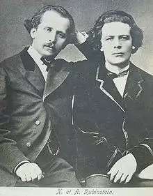 Rubinstein was impressed by Tchaikovsky's musical talent on the whole and cited him as "a composer of genius" in his autobiography.[38] He was less pleased with the more progressive tendencies of some of Tchaikovsky's student work.[39] Nor did he change his opinion as Tchaikovsky's reputation grew.[a 5][a 6] He and Zaremba clashed with Tchaikovsky when he submitted his First Symphony for performance by the RMS in Saint Petersburg. Rubinstein and Zaremba refused to consider the work unless substantial changes were made. Tchaikovsky complied but they still refused to perform the symphony.[40] Tchaikovsky, distressed that he had been treated as though he were still their student, withdrew the symphony. It was given its first complete performance, minus the changes Rubinstein and Zaremba had requested, in Moscow in February 1868.[41]