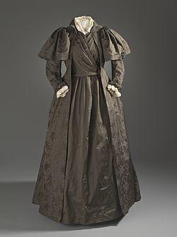A tea gown or tea-gown is a woman's dress for informal entertaining at home. These dresses, which became popular around the mid-19th century, are characterized by unstructured lines and light fabrics. Early tea gowns were a European development influenced by Asian clothing and historical approach from the 18th century which led to the renaissance time period of long and flowing sleeves.[1][2] Part of this European sense of fashion came from the Japanese kimono.[3]