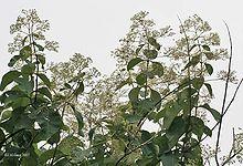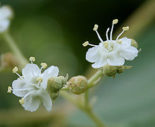 Fragrant white flowers are borne on 25–40 cm (10–16 in) long by 30 cm (12 in) wide panicles from June to August. The corolla tube is 2.5–3 mm long with 2 mm wide obtuse lobes. Tectona grandis sets fruit from September to December; fruits are globose and 1.2-1.8 cm in diameter.[6] Flowers are weakly protandrous in that the anthers precede the stigma in maturity and pollen is shed within a few hours of the flower opening.[7] The flowers are primarily entomophilous (insect pollinated), but can occasionally be anemophilous (wind pollinated).[8] A 1996 study found that in its native range in Thailand, the major pollinator were species in the bee genus Ceratina.[7]