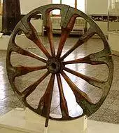 The invention of the wheel revolutionized trade and war. It did not take long to discover that wheeled wagons could be used to carry heavy loads. The ancient Sumerians used the potter's wheel and may have invented it.[49] A stone pottery wheel found in the city-state of Ur dates to around 3429 BCE,[50] and even older fragments of wheel-thrown pottery have been found in the same area.[50] Fast (rotary) potters' wheels enabled early mass production of pottery, but it was the use of the wheel as a transformer of energy (through water wheels, windmills, and even treadmills) that revolutionized the application of nonhuman power sources. The first two-wheeled carts were derived from travois[51] and were first used in Mesopotamia and Iran in around 3000 BCE.[51]