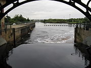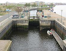 The lock is a single-rise lock with two pairs of lock gates to allow light river traffic to negotiate the barrage. The dimensions of the lock are length 24.88 m, beam 6.08 m, height 5.37 m with a draught of 2.48 m.[20] If necessary, when the lock is in use, a single leaf steel bascule lifting bridge over the lock is raised to allow the passage of lock traffic. There is no charge to use the lock however users must have permits to use the river both above and below the barrage.