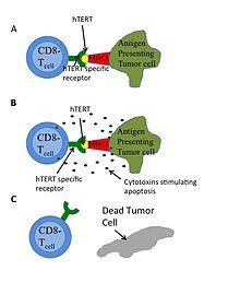 Immunotherapy successfully treats some kinds of cancer, such as melanoma. This treatment involves manipulating a human's immune system to destroy cancerous cells. Humans have two major antigen identifying lymphocytes: CD8+ cytotoxic T-lymphocytes (CTL) and CD4+ helper T-lymphocytes that can destroy cells. Antigen receptors on CTL can bind to a 9-10 amino acid chain that is presented by the major histocompatibility complex (MHC) as in Figure 4. HTERT is a potential target antigen. Immunotargeting should result in relatively few side effects since hTERT expression is associated only with telomerase and is not essential in almost all somatic cells.[54] GV1001 uses this pathway.[46] Experimental drug and vaccine therapies targeting active telomerase have been tested in mouse models, and clinical trials have begun. One drug, imetelstat, is being clinically researched as a means of interfering with telomerase in cancer cells.[55] Most of the harmful cancer-related effects of telomerase are dependent on an intact RNA template. Cancer stem cells that use an alternative method of telomere maintenance are still killed when telomerase's RNA template is blocked or damaged.