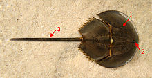 The term telson is widely used for the caudal spine of some chelicerates.[2][3] The chelicerate telson can be clearly seen in a number of fossil species (like in eurypterids) and in extant animals (like the horseshoe crab "tail" and the scorpion sting). Some authorities have urged that the usage of this word in this context be discouraged.[4]