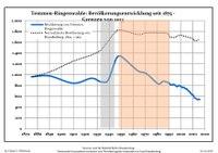 Development of population since 1875 within the current boundaries (Blue line: Population; Dotted line: Comparison to population development of Brandenburg state; Grey background: Time of Nazi rule; Red background: Time of communist rule)