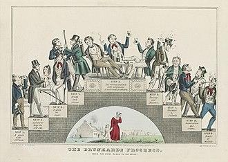 The temperance movement in the United States began at a national level in the 1820s, having been popularized by evangelical temperance reformers and among the middle classes.[3]:109[10][2]:38[note 1] There was a concentration on advice against hard spirits rather than on abstinence from all alcohol, and on moral reform rather than legal measures against alcohol.[12][note 2] An earlier temperance movement had begun during the American Revolution in Connecticut, Virginia and New York state, with farmers forming associations to ban whiskey distilling. The movement spread to eight states, advocating temperance rather than abstinence and taking positions on religious issues such as observance of the Sabbath.[1]
