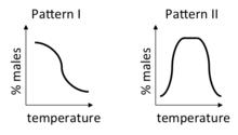 Pattern II has two transition zones, with males dominating at intermediate temperatures and females dominating at both extremes.[14] Pattern II occurs in some turtles, lizards, and crocodilians.[15] Very near or at the pivotal temperature of sex determination, mixed sex ratios and (more rarely) intersex individuals.[13]