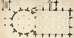 The church building comprises two separate sections: The original circular church building, called the Round Church and now acting as a nave, and a later rectangular section adjoining on the east side, built approximately half a century later, forming the chancel.
