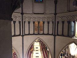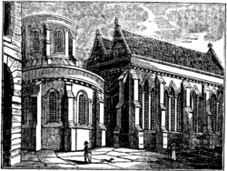 The Temple Church is a Royal peculiar[2] church in the City of London located between Fleet Street and the River Thames, built by the Knights Templar as their English headquarters. It was consecrated on 10 February 1185 by Patriarch Heraclius of Jerusalem.[3] During the reign of King John (1199–1216) it served as the royal treasury, supported by the role of the Knights Templar as proto-international bankers. It is now jointly owned by the Inner Temple and Middle Temple[4] Inns of Court, bases of the English legal profession. It is famous for being a round church, a common design feature for Knights Templar churches,[5] and for its 13th- and 14th-century stone effigies. It was heavily damaged by German bombing during World War II and has since been greatly restored and rebuilt.