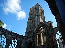 Temple Church, also known as Holy Cross Church, (grid reference ST5972) is a ruined church in Redcliffe, Bristol, England. It is on the site of a previous, round church of the Knights Templar, which they built on land granted to them in the second quarter of the 12th century by Robert of Gloucester. In 1313 the Knights Hospitaller acquired the church, following the suppression of the Templars, only to lose it in 1540 at the time of the Dissolution of the Monasteries. By the early 14th century, the church served as the parish church for the area known as Temple Fee. From around the same time, the rebuilding of the church on a rectangular plan started. This was completed by 1460, with the construction of a leaning west tower.